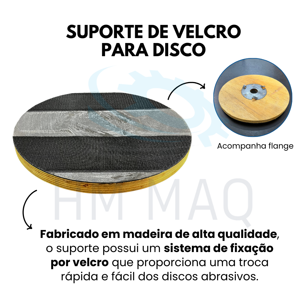 O Suporte para Enceradeira com base de madeira em compensado naval e manta de velcro garante fixação segura e eficiente para discos abrasivos. Projetado para uso profissional, proporciona durabilidade e estabilidade em diversas operações de limpeza e polimento de pisos.