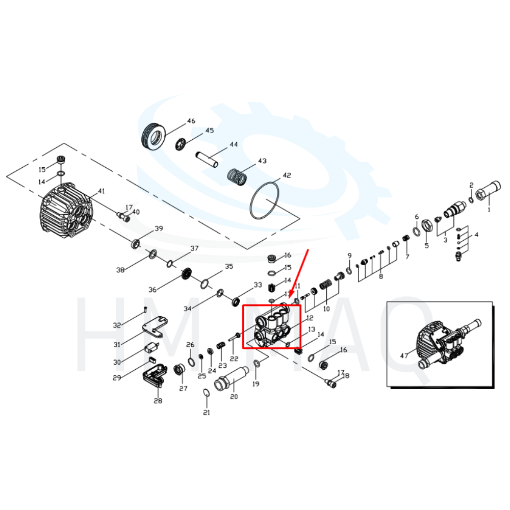 O cabeçote da lavadora de alta pressão é uma peça fundamental da bomba, responsável por gerar, controlar e direcionar o fluxo da água, garantindo a pressão ideal para a limpeza. É feito de materiais resistentes, para suportar o uso contínuo e a alta pressão sem desgastar. Caso apresente danos ou vazamentos, deve ser substituído para manter o bom funcionamento da lavadora.